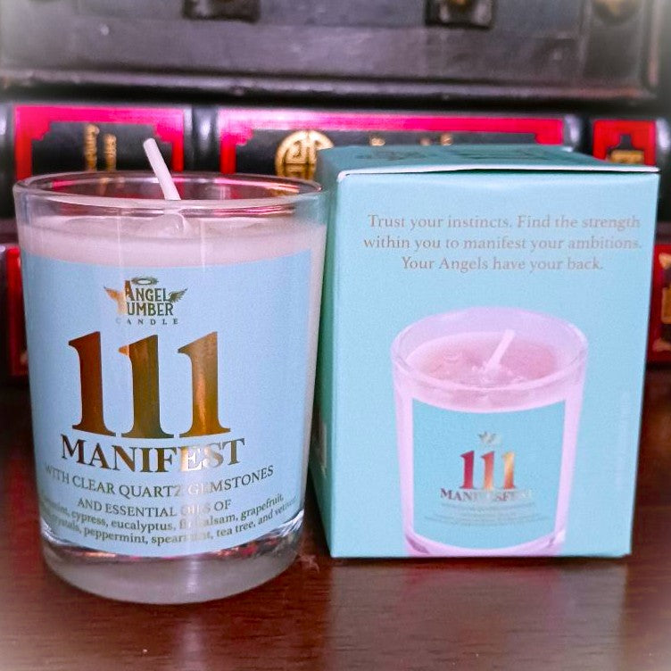 The Angel Number Candle 111 Manifest features a soy wax blend infused with a 100% essential oil combination of cornmint, cypress, eucalyptus, fir balsam, grapefruit, menthol, peppermint, spearmint, tea tree, and vetiver. Paired with genuine clear quartz gemstones, this candle supports balance and awakening, encouraging positive thought and focused energy.