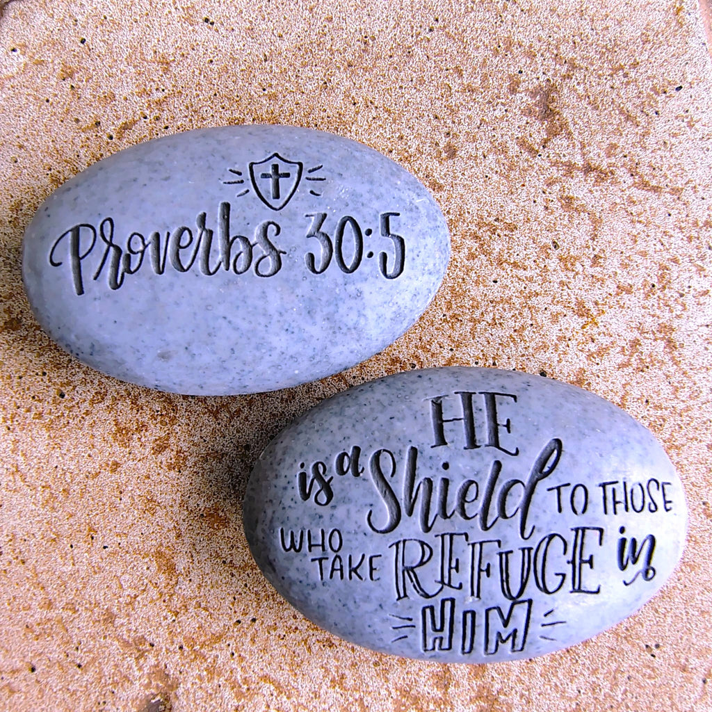 Our "Proverbs 30:5" Stone offers a profound and uplifting message engraved in hand-drawn typography. The front reads "He is a Shield to those Who take Refuge in Him," while the back features the verse reference and a small shield with a Cross. This double-sided resin Pocket Stone fits perfectly in your pocket or palm.