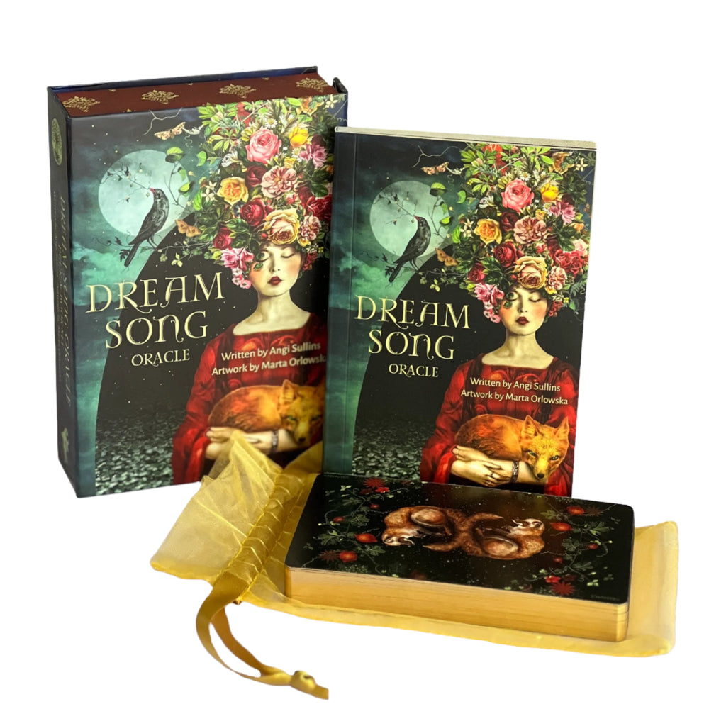 Dive into the whimsical world of the Dream Song Oracle, a deluxe 45-card deck with gold gilt edges that spark your imagination. Accompanied by a colorful 104-page illustrated guidebook, this playful set helps you develop intuition, explore your inner magic, and uncover the gentle wisdom within. Written by Angi Sullins, Artwork by Marta Orlowska. Perfect for joyful self-discovery and enchanting readings, it invites you to sing along with your dreams and embrace the magic of your heart.