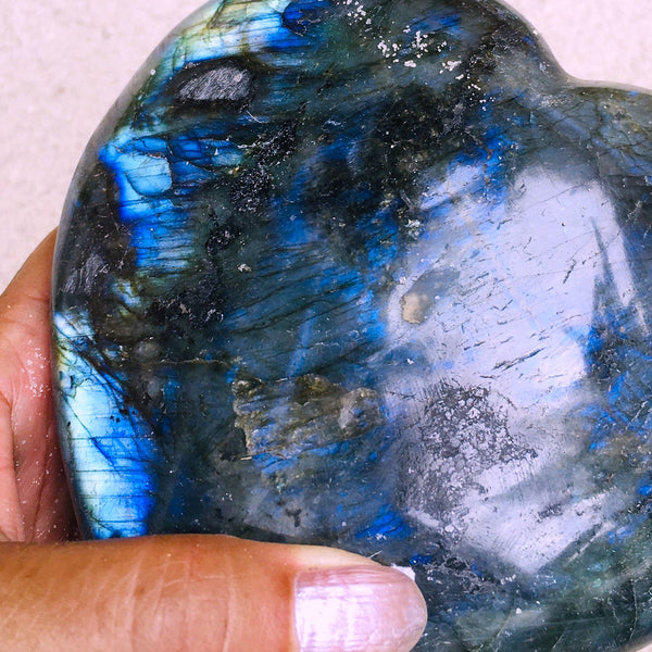 Expertly shaped and polished Labradorite Heart stone dazzles with vibrant blue flashes that catch the light beautifully. Perfect for adding a splash of mystical charm to your space or gifting a touch of wonder to someone special.