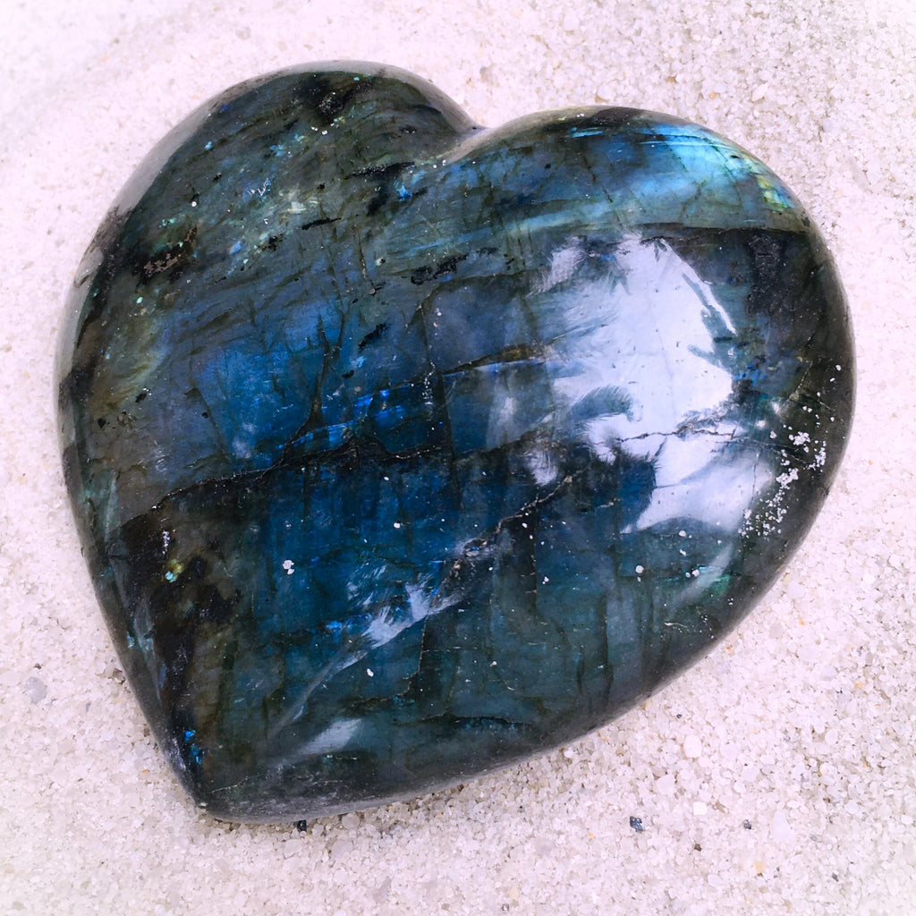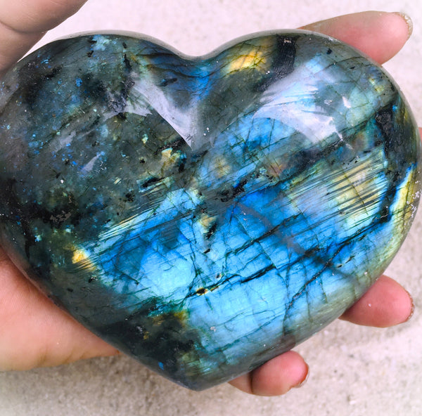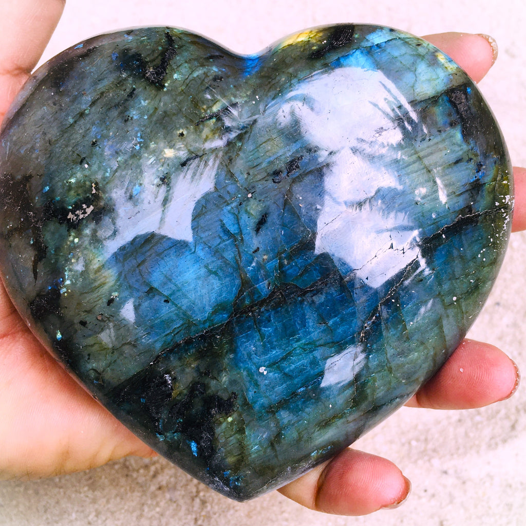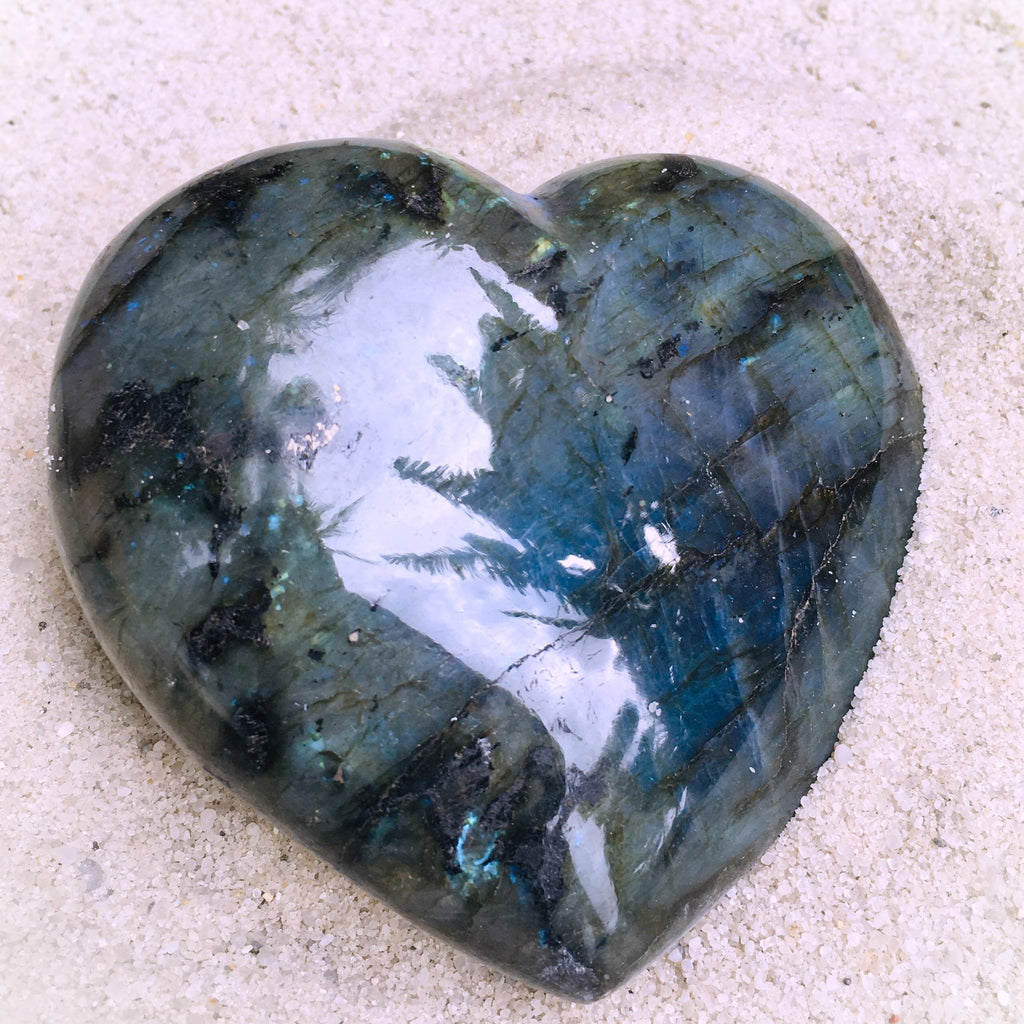 Expertly shaped and polished Labradorite Heart stone dazzles with vibrant blue flashes that catch the light beautifully. Perfect for adding a splash of mystical charm to your space or gifting a touch of wonder to someone special.